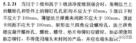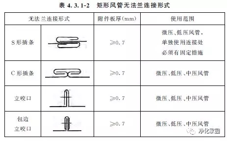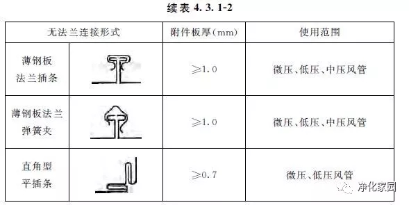 看到没5级和高于5级,就是角钢法兰了,有人说没有“共板法兰”呀,嗯,确实没有这个文字,这就是书面与实操的区别,这个“薄壁法兰弹簧夹”就表明了是“共板法兰”了。这是那个规范?来,查《洁净室施工及验收规范GB50591-2010》。好事做到底,再延伸下。以下几个所谓的无法兰就是共板法兰的意思,共板法兰看来只是实操派们的叫法,一个板上既是风管又是法兰有人叫共板,人家写规范的根本就不承认你是法兰。